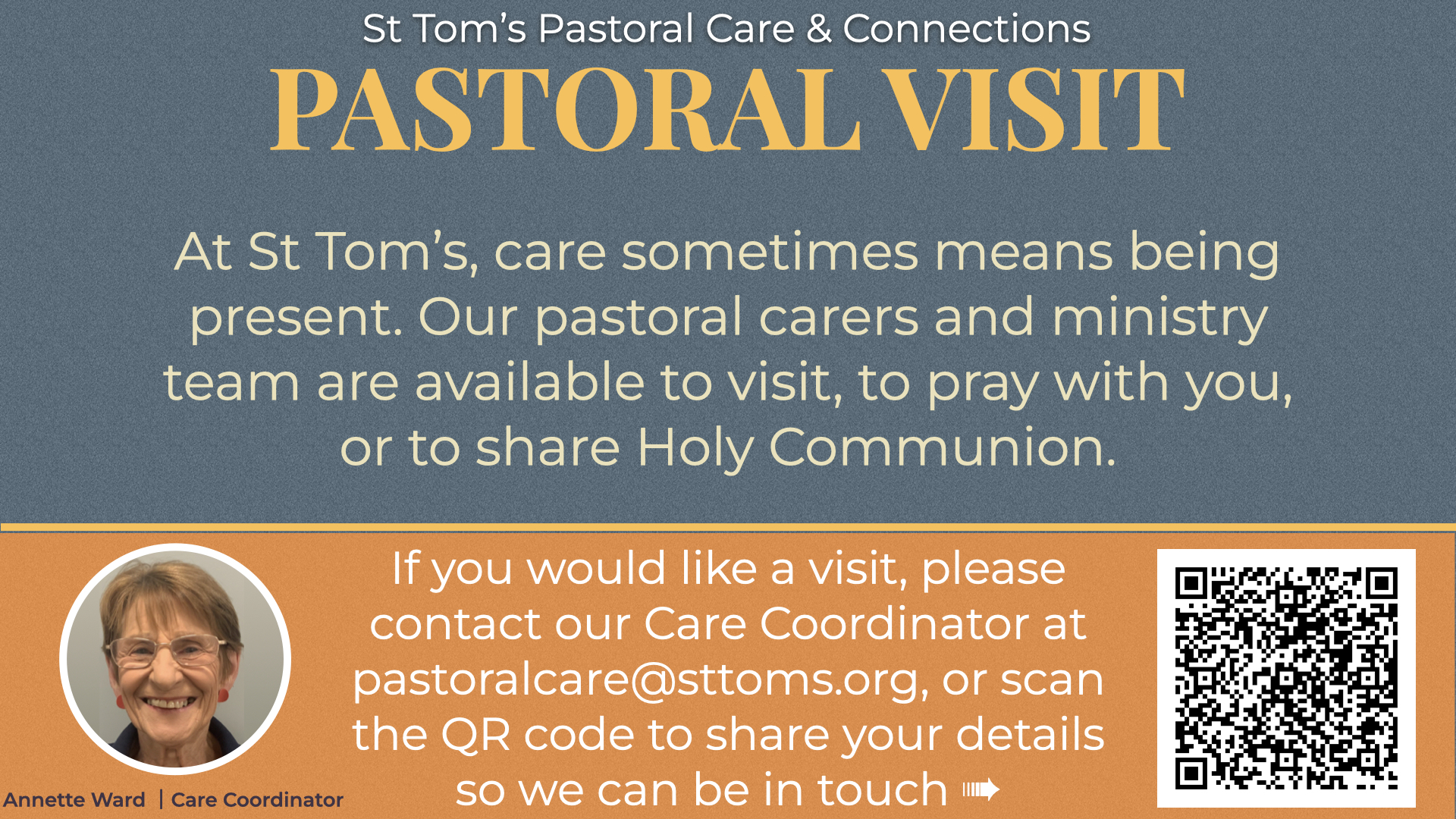 Another way we care at St Tom’s is through pastoral visits—whether at home or in hospital, for prayer, encouragement, or Holy Communion. If you’d like a visit, please scan the QR code, or speak to one of our Care Coordinators, Ministry Team, or Welcomers